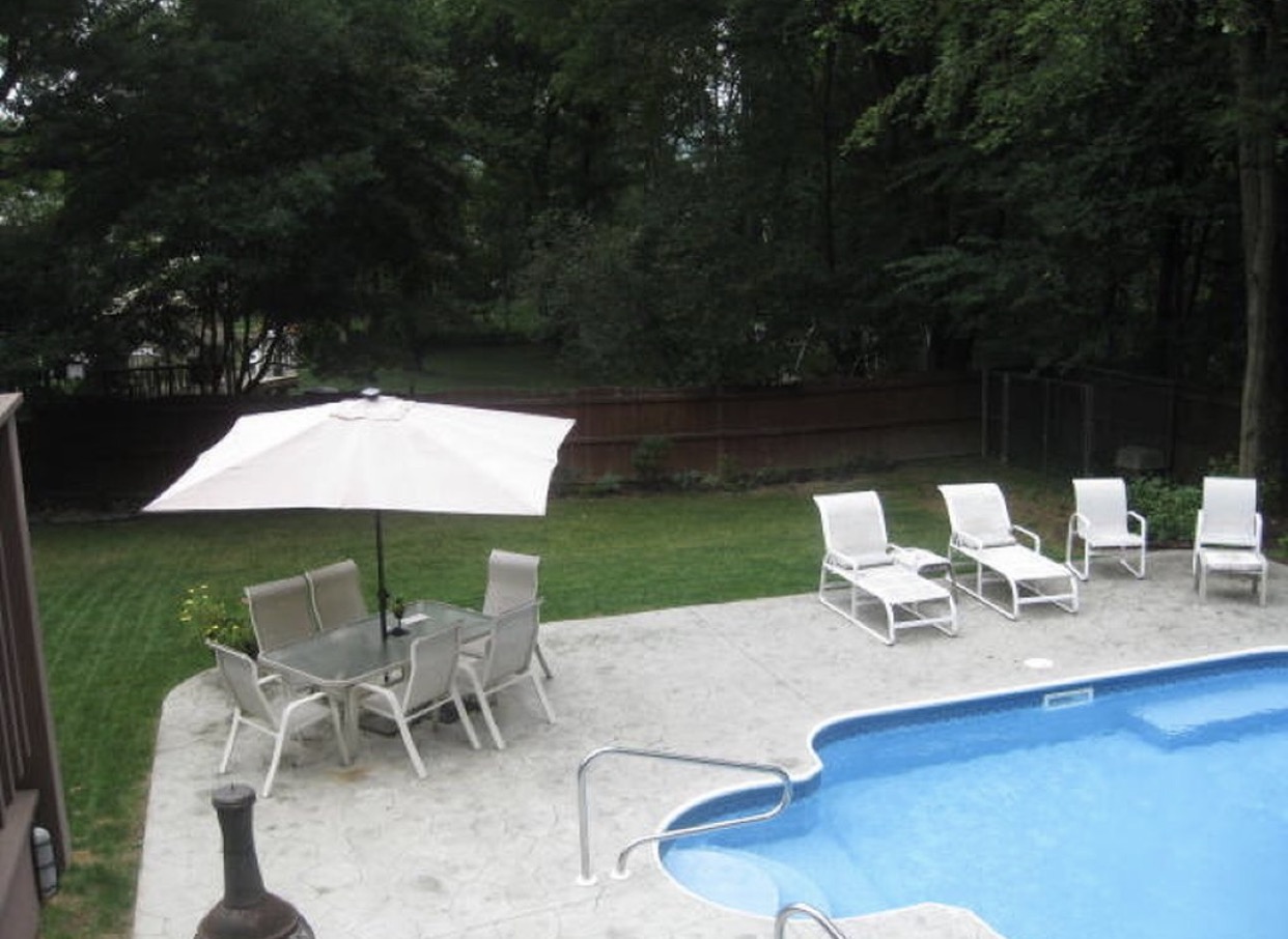 We fell in love with this backyard, particularly because we don’t have any neighbors behind us – just plenty of woods and privacy. We just opened the pool a week ago and according to the previous owner, it hasn’t been opened since 2015 so we have some work to do before it’s clean enough to jump into. But here are some photos from the listing and what we’re hoping it will look like in a few weeks!
