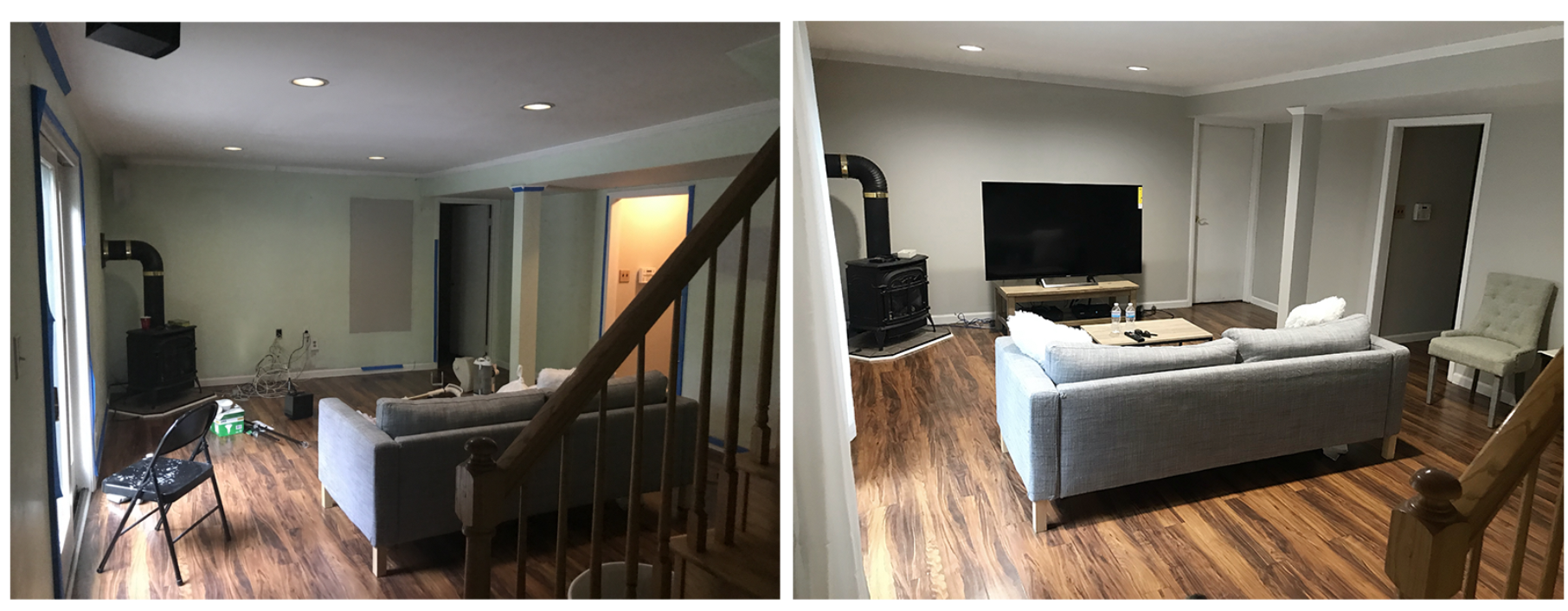 Beginning with the room that’s made the least amount of progress…the basement. We painted, bought a TV and threw in an old Ikea sofa for the time being. This is my next big project and my greatest challenge will be to ensure Angelo is happy with the design because he hangs out down here the most. He walked into my office a few weeks ago and told me his two very specific requests for me to keep in mind when designing this room: