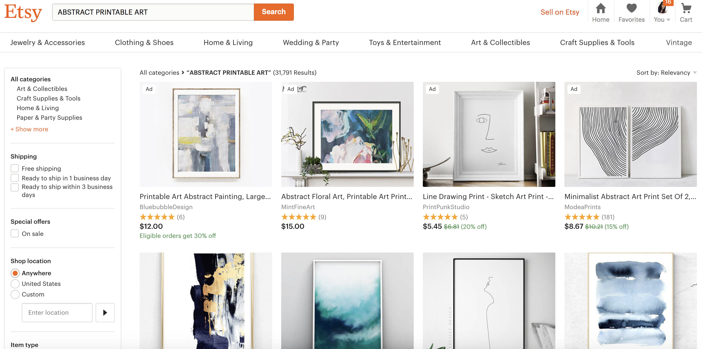 Search keywords that describe what you’re looking for, and if you don’t know what you’re looking for, start with searching “printable art.”